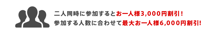 - 2名様で参加の場合:お一人様3,000円割引(トータル:6,000円割引)