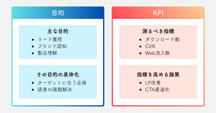 目的が決まったら、それを定量化するKPI(ダウンロード数、成約率、問い合わせ率など)を設定しておきましょう。目標数値があることで、後の評価・改善がしやすくなります。